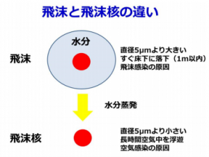 飛沫核とは、飛沫の水分が蒸発した小さな粒子のことで、これを吸いこむことで感染するのが飛沫核感染、つまり空気感染ということになります。