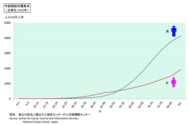 男性は40歳代までは女性よりがんの罹患率(りかんりつ)が低いですが、50歳を超えると女性の罹患率を超え、年齢が高くなるほど上昇します。60歳代では女性に比べて顕著に高くなります。高齢になるほど、がんの罹患率は高くなります。