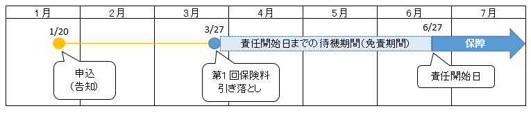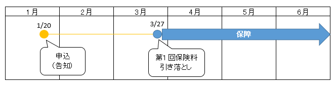 アフッラクの契約で「責任開始期に関する特約」をセットしない場合、下図の契約例の場合、保障開始は第1回保険料の引き落とし日である3月27日になります。つまり、申込(告知)日の1月20日から保障(責任)開始日の3月27日までの約2ヶ月間、保障がない期間が発生します。