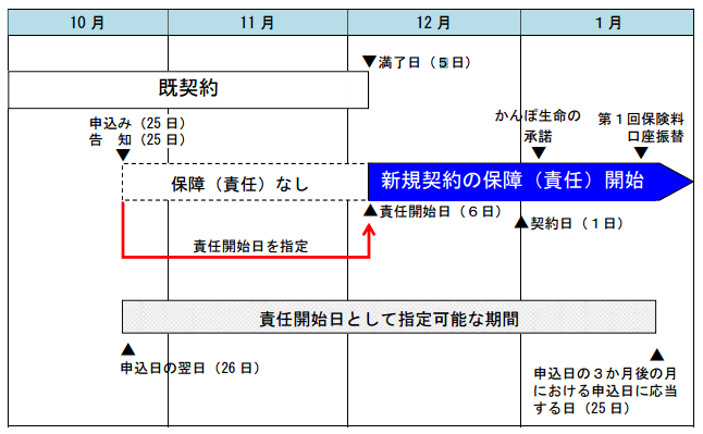 指定できる保障(責任)開始日は、「申込日の翌日から申込日の3ヶ月後の月における申込日に応当する日まで」です。