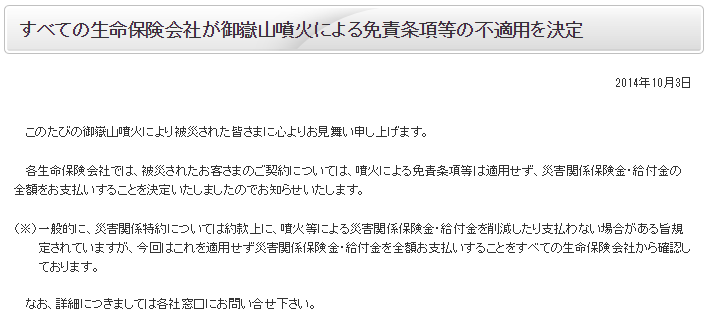 また、各生命保険会社は御嶽山噴火に伴い被災された方の契約については噴火による免責条項等を適用せず、災害関係保険金・給付金の全額を支払うことを決定しました。