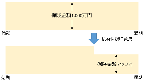 払済保険とは、加入している保険の保険料の支払いを止め、その時点での解約返戻金を原資として、保険期間はそのままで同種類の保険に変更する方法になります。