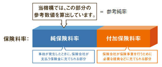 保険料率は純保険料率と付加保険料率で構成され、損害保険料算出機構では純保険料率部分を算出しています。損害保険料算出機構が算出する純保険料率を「参考純率」といいます。
