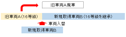 例)旧車両A(16等級)を廃車し、新規取得した車両Bと車両入替を行う。