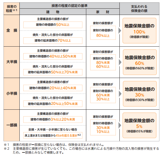 例えば、保険の対象が建物の場合、「地震保険損害認定基準」に従い、主要構造部(基礎・柱・壁・屋根等)の損害の程度に応じて「全損」「大半損」「小半損」「一部損」の認定を行います。認定された「全損」「大半損」「小半損」「一部損」について、それぞれ地震保険金額の100%(時価額が限度)、60%(時価額の60%が限度)、30%(時価額の30%が限度)、5%(時価額の5%が限度)を定額で支払います。