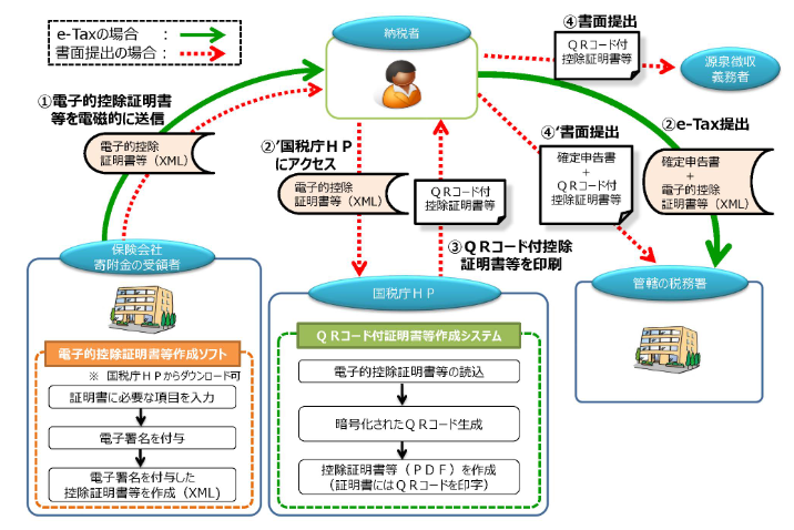 なお、再発行を依頼するのではなく、契約者専用WEBサイト上でダウンロードした生命保険料控除証明書の電子データを国税庁WEBサイト上の「QRコード付証明書等作成システム」で印刷可能な形式(QRコード付PDFファイル)に変換、印刷して確定申告や年末調整に使用することもできます。