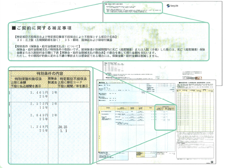 特別条件には下記のような種類があり、被保険者(保障の対象者)の健康状態等の状況に応じていずれか又は併用した条件が付くことがあります。