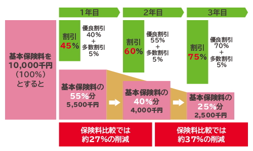 ※フリート契約とは、契約台数が10台以上の自動車保険契約です。一方、契約台数が9台以下の契約をノンフリート契約といいます。フリート契約は、事故が少なければ翌年度の優良割引率が上がる仕組みになっています。下図の通り、事故が削減できれば、次年度以降の優良割引率が上がり、保険料負担が軽減される可能性があります。